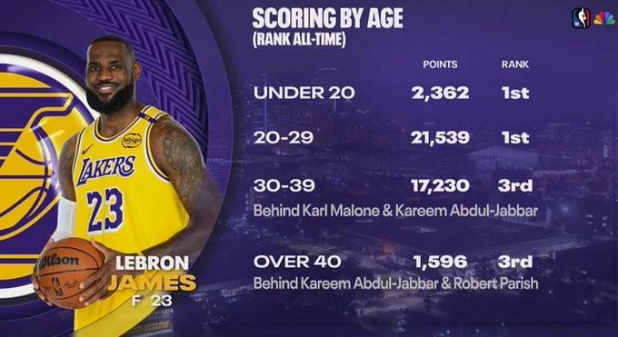 赛前,转播方晒出了一组关于詹姆斯的数据,数据为詹姆斯职业生涯得分按年龄段的分布情况。